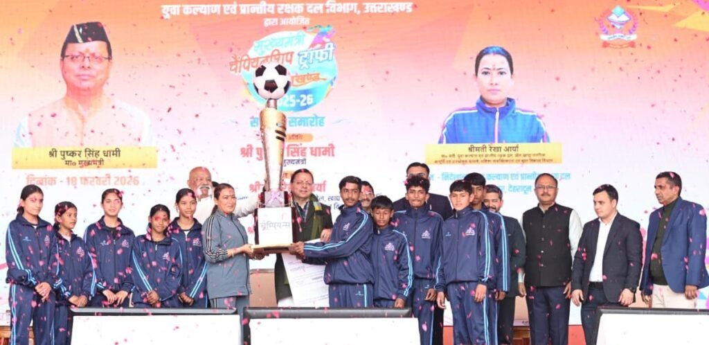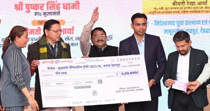 मुख्यमंत्री पुष्कर सिंह धामी ने बुधवार को ननूरखेड़ा,देहरादून में मुख्यमंत्री चैम्पियनशिप ट्रॉफी 2025-26 के समापन समारोह में प्रतिभाग किया। इस अवसर पर मुख्यमंत्री ने देहरादून जनपद को विजेता ट्रॉफी एवं 05 लाख रुपये का चेक प्रदान किया।