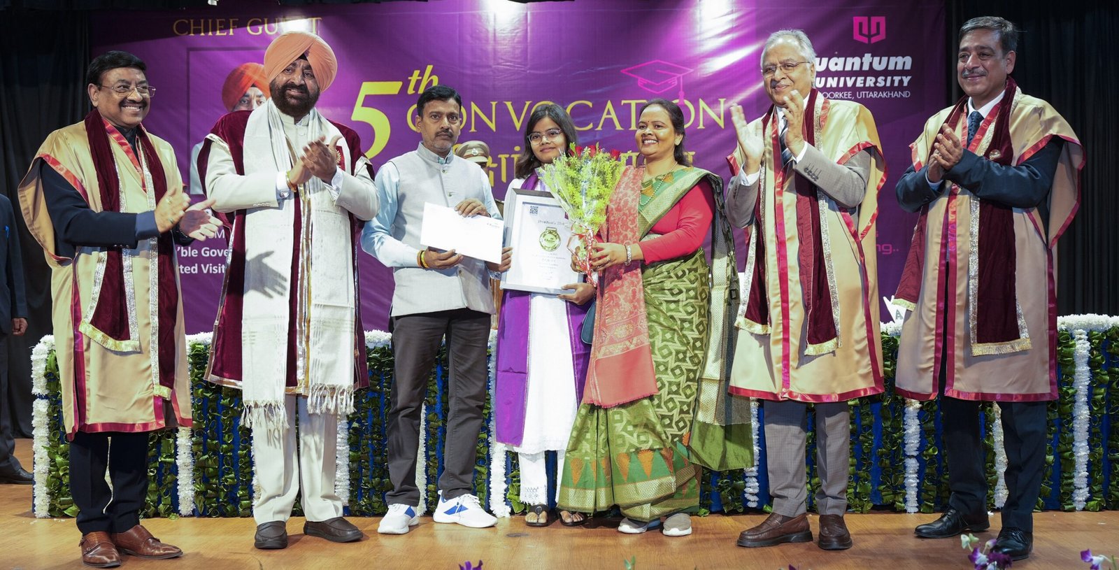 राज्यपाल लेफ्टिनेंट जनरल गुरमीत सिंह (से नि) ने शनिवार को क्वांटम विश्वविद्यालय,रुड़की के 5वें दीक्षांत समारोह में मुख्य अतिथि के रूप में प्रतिभाग किया। राज्यपाल ने उत्कृष्ट प्रदर्शन करने वाले विद्यार्थियों को गोल्ड मेडल प्रदान किए। इस अवसर पर विश्वविद्यालय में सर्वश्रेष्ठ उत्कृष्ट प्रदर्शन करने वाली छात्रा साक्षी राज को प्रेसिडेंस मेडल से सम्मानित किया गया। राज्यपाल ने विद्यार्थियों को अपने जीवन में बड़े लक्ष्य निर्धारित करने,परिश्रम और अनुशासन के साथ कार्य करने और समाज तथा राष्ट्र के प्रति अपनी जिम्मेदारियों को निभाने की प्रेरणा दी।