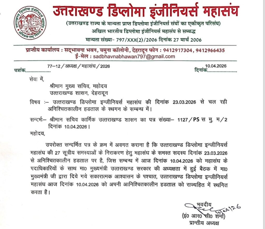 उत्तराखण्ड डिप्लोमा इन्जीनियर्स महासंघ के प्रांतीय अध्यक्ष इं.आर.सी.शर्मा ने बताया कि 27 सूत्रीय समस्याओं के निराकरण हेतु महासंघ के समस्त सदस्य दिनांक 23 मार्च,2026 से अनिश्चितकालीन हडताल पर थे। उन्होंने बताया इस सम्बन्ध में आज शुक्रवार को महासंघ के पदाधिकारियों के साथ मुख्यमंत्री पुष्कर सिंह धामी की अध्यक्षता में हुई बैठक में मुख्यमंत्री द्वारा दिये गये सकारात्मक आश्वासन के पश्चात,उत्तराखण्ड डिप्लोमा इन्जीनियर्स महासंघ ने आज दिनांक 10 अप्रैल,2026 को अपनी आनिश्चितकालीन हड़ताल को राज्यहित में स्थगित करने का निर्णय लिया है।